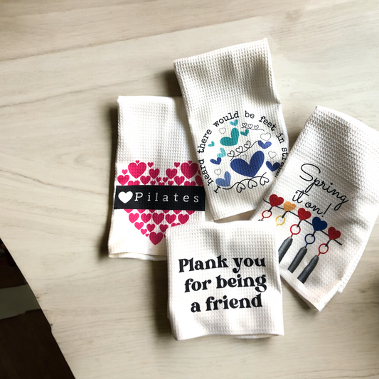 Pilates Towels set of 4, Heard There Would be Feet in Straps, Plank you for being a friend, Pilates Heart, Spring it on waffle weave towel set, pilates gifts