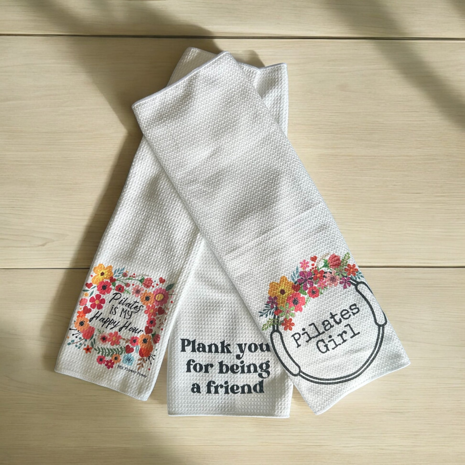 Pilates Girl towel set. Pilates girl floral ring towel, floral Pilates is my happy hour towel and Plank, Plank you for being a friend towel.