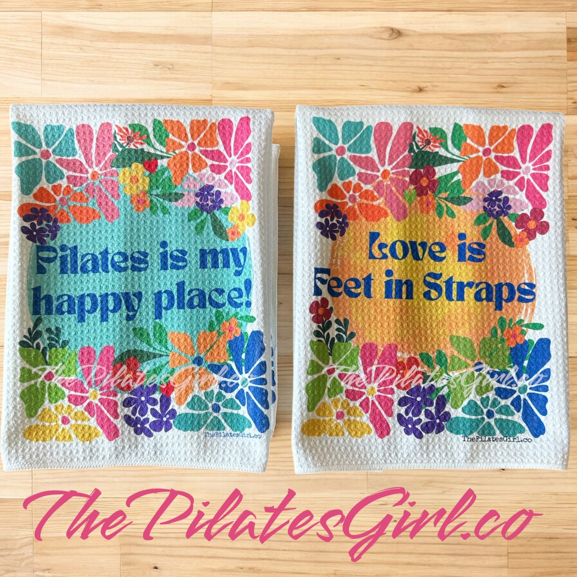 Celebrate your love for Pilates with this fun and vibrant towel set featuring retro floral designs. Perfect for Pilates lovers and pros alike, these super absorbent waffle weave towels stay soft and effective wash after wash. A playful way to brighten your workout routine.